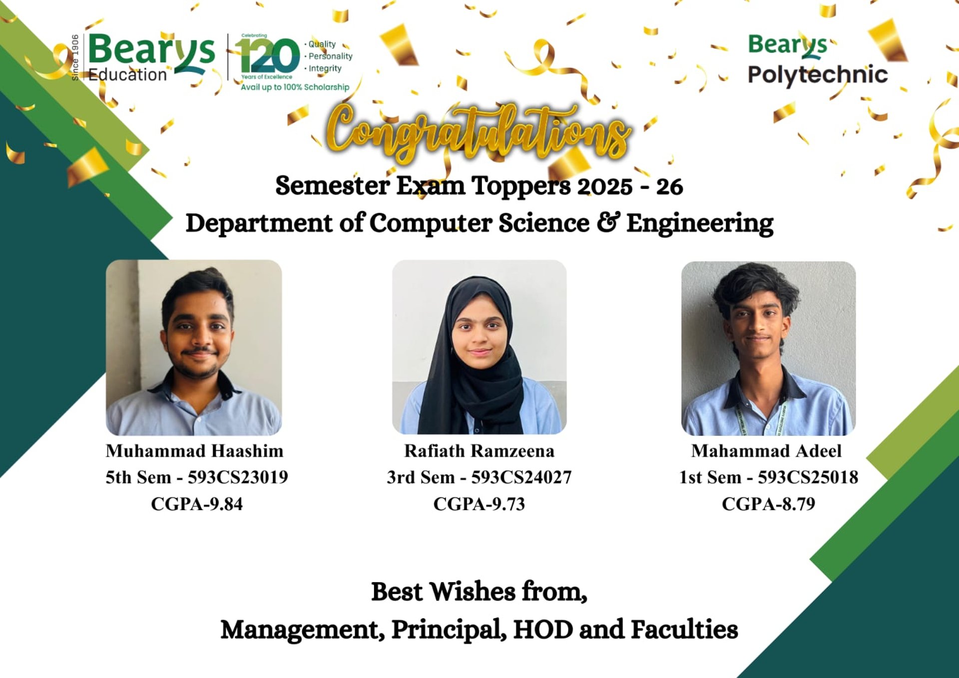 The Management, Principal, Head of the Department, and all faculty members extend their heartfelt congratulations and best wishes to the students for their outstanding performance and wish them continued success in their academic journey.